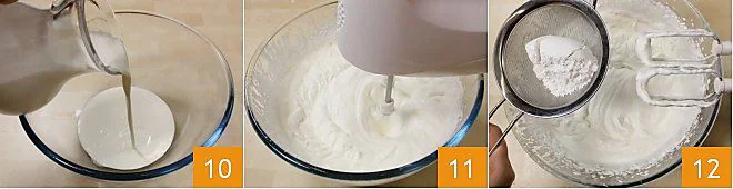 Now proceed to prepare the whipped cream for garnishing (you can also consult the procedure here: How to Whip Cream). Pour the well-cold fresh liquid cream into a large bowl 10 and with the cold beaters of an electric mixer, whip the cream until stiff peaks form 11. At this point, add the sifted powdered sugar 12 and incorporate it into the cream with a spatula, mixing from bottom to top to avoid deflating, and set aside.