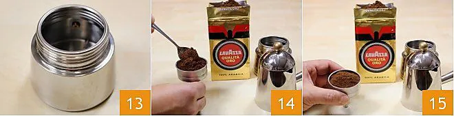 Now you can prepare the coffee with the moka pot: pour the cold water, preferably low in limescale, inside the boiler up to the safety valve 13 (otherwise you will get a longer coffee). Fill the filter with ground coffee 14 and level it with each added teaspoon of coffee by tapping the filter on the table with firm movements 15, until reaching the edge of the filter.