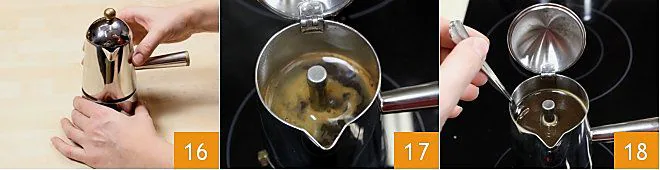 Do not press with the teaspoon, nor make holes, and screw the coffee maker tightly 16 (to prevent coffee from leaking from the sides as it rises), then place it on a low and steady flame, to obtain a full-bodied coffee. As the coffee rises, a thick foam will form 17; we recommend not letting the coffee bubble for too long, to keep its aroma and sweetness intact. Then turn off the heat, stir the coffee directly in the moka with a teaspoon to make it more homogeneous 18, and your coffee for use in the preparation is ready.