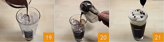 Then proceed to assemble your iced mocha. For each tall glass, put 6-7 ice cubes, then pour in the order first 50 ml (about 0.21 cups) of cold chocolate 19, then 50 ml (about 0.21 cups) of coffee 20 leaving 1-1.5 inches from the rim. Stir and finish preparing the iced mocha with the whipped cream garnish, using a pastry bag with a star nozzle. Continue in the same way for the other glasses. You can optionally add more melted chocolate on top of the cream for an even tastier iced mocha 21!