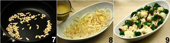 Toast the pine nuts in a pan 7 until they take on a nice copper color. Cut the Belgian endive into thin strips, place them at the bottom of the plate, and dress with a bit of dressing 8. Add the cauliflower and broccoli and distribute a tablespoon of dressing over the vegetables. Finally, sprinkle the pine nuts and raisins 9 and finish with a dash of nutmeg and black pepper.