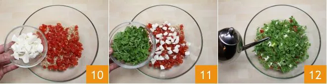 drain the preservation water from the mozzarella balls and dice them 7. Prepare the arugula by washing it well under water; coarsely chop the arugula leaves 8. At this point, take the bowl with the grains and add the cherry tomatoes 9,