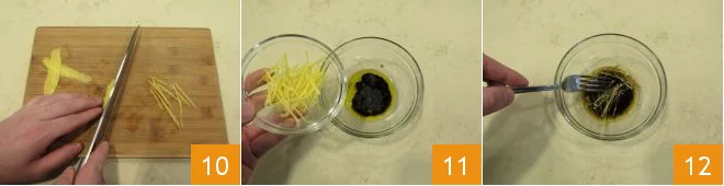 Then cut into thin strips 10, add them to the bowl with the oil 11, and briefly emulsify everything with a fork 12.