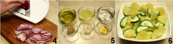 Slice the red onion into very thin pieces 4 using a mandoline or a sharp knife. In a blender, add the extra virgin olive oil, lukewarm water, lemon juice, honey, mustard, and the garlic clove 5 peeled and crushed with a spoon until you obtain a puree. Blend for about two minutes and adjust with salt and pepper, regulating the consistency of the dressing by adding more oil or lukewarm water. Arrange the potato slices on a plate with the cucumbers 6.