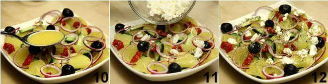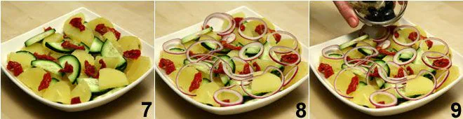 Drain and chop the sun-dried tomatoes and sprinkle the strips over the potato and cucumber salad 7. Add some rings of red onion 8, and the black olives 9.