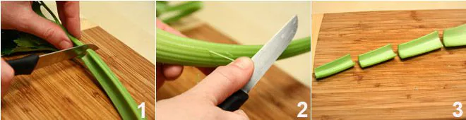 Separate the celery stalks from the leaves 1, remove the fibrous elements 2, and cut them into pieces about 2 inches long 3.