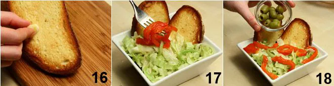 Finally, brush the 8 slices of bread with some oil and put them in the oven to toast. When the bread is well toasted, lightly rub the garlic clove on the slices that will accompany the salad 16. Plate the salad and add the pepper fillets 17,