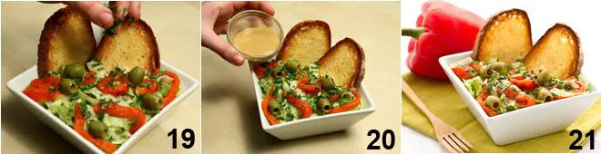 the green olives 18, the chopped celery leaves 19, and put the remaining dressing on top 20. Serve the celery and pepper salad with the toasted bread bruschetta 21.