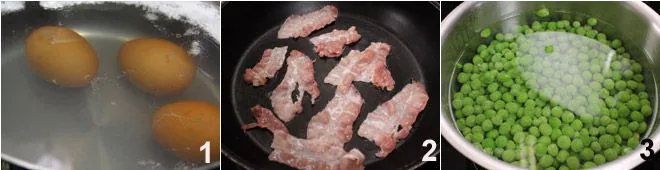 To prepare the seven-layer salad, start by placing the eggs in a saucepan and boiling them 1 to harden; once the eggs are cooked, let them cool. Place the bacon slices on a grill 2 and cook them until they become crispy. Meanwhile, cook the frozen peas 3, being careful not to overcook them; they should remain whole. Slice the tomatoes and cut the Cheddar slices into thin strips.