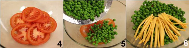At this point, start assembling the salad: take a large bowl with a diameter of about 8 inches and start composing the seven layers, starting with the tomato slices 4 which should cover the base of the bowl, add the peas 5 trying to distribute them evenly, continue by placing the Cheddar strips in a radial pattern 6,