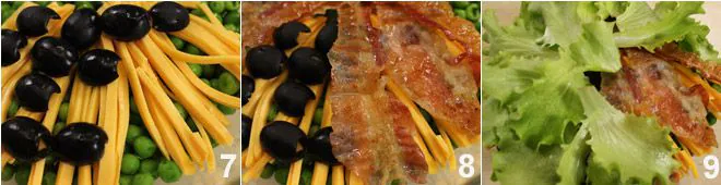 add a layer of olives 7 and a layer of bacon strips 8, cover with lettuce leaves 9. Finish the composition with the hard-boiled eggs cut into quarters. Serve the seven-layer salad and dress it to taste with oil, salt, and vinegar.