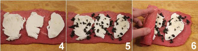 On each slice of meat, place 2/3 well-drained slices of mozzarella 4, distribute the chopped olives 5, and roll the meat from the short side like a roll 6,