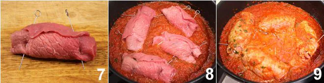 which you will secure with two toothpicks 7. Place the prepared rolls in the sauce 8, salt them on both sides, cover with a lid, and cook over a very low heat (the sauce should just simmer) for about 20 minutes. At the end of cooking 9, adjust the salt. If the mozzarella has released water during cooking, remove the rolls from the pan, keep them warm, and slightly reduce the sauce! Serve the rolls hot with some mashed potatoes or boiled rice!