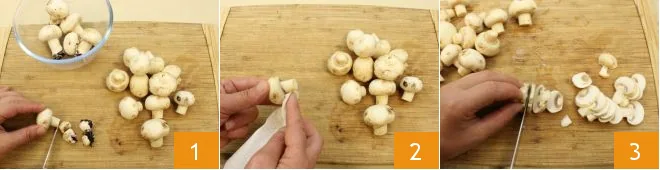 To make chicken rolls with mushrooms and mustard sauce, start by cleaning the champignon mushrooms: with a small knife, remove the earthy part on the stem 1, scraping it gently until all traces of dirt are removed, then gently wipe the surface with a damp cotton cloth 2, taking care not to damage the mushrooms. Slice the mushrooms 3 and set them aside.