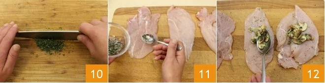 Chop the thyme 10 and place it in a small bowl, also add salt and mix to combine, distribute the herb mixture on the chicken slices 11, then stuff with a spoonful of mushrooms in the center of the slices, leaving the edge free 12 (set aside the leftover mushrooms).