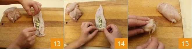 Fold the long sides of the slices inward to prevent the filling from escaping 13 and then roll them up 14, secure the rolls with toothpicks 15 so they won't open during cooking.