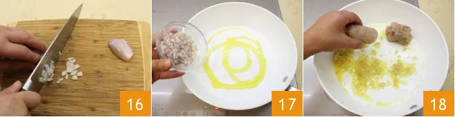 Set the rolls aside, peel and chop the shallot 16, heat a drizzle of olive oil in a pan and sauté the shallot 17 for at least 5 minutes on low heat, place the chicken and mushroom rolls with mustard sauce in the pan 18.