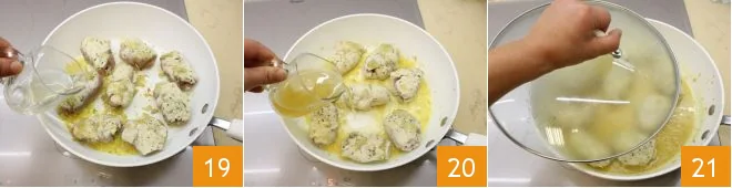and brown on both sides for a couple of minutes, then deglaze with white wine 19 and add the Chicken broth 20 and cook for 10 minutes with the lid on for another 10 minutes 21.