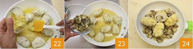 then incorporate the mustard 22 and cook for another 3-4 minutes, at the end of cooking add the leftover mushrooms 23 and sauté everything together for a few moments and serve the chicken rolls with mushrooms and mustard sauce hot 34.