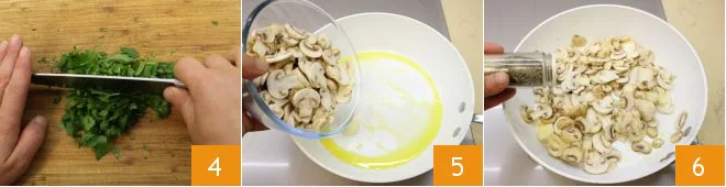 Wash and chop the fresh parsley 4, heat a drizzle of oil in a pan and flavor it with a garlic clove, add the sliced mushrooms 5 and sauté them for 4-5 minutes, season with salt and pepper 6.