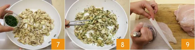 then flavor with the chopped parsley 7, stir, and remove the garlic clove with kitchen tongs 8, let the mushrooms cool. Prepare the meat, place the chicken slices between two sheets of parchment paper (to avoid tearing the meat) and pound them with a meat tenderizer 9.