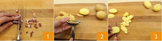 To make the turkey rolls with potatoes, ricotta, and bacon, cut the smoked bacon into cubes 1, then peel the potatoes 2 and dice them 3.