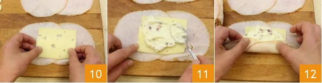 Now assemble the rolls: take two slices of turkey and slightly overlap them, place a slice of Emmental on top 10, spread the potato and ricotta cream on top 11, then fold the two long edges towards the center 12