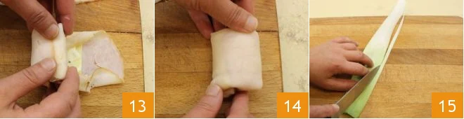 then fold the shorter sides as well (13-14). Peel the leek, wash the leaves, and cut 12 thin strips 15,