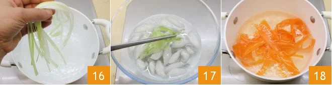 blanch them in boiling water 16 to make them soft and elastic, then cool them by immersing them in a bowl full of ice water 17 to maintain the color. Do the same with the carrot, peel it and use a vegetable peeler to cut 12 thin strips, blanch them to soften 18