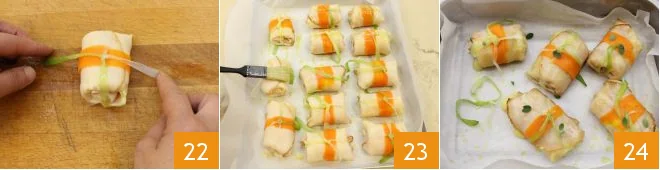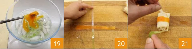 and then cool them in the bowl with ice water 19. Now proceed to tie the rolls: on a cutting board, place a strip of leek and a strip of carrot crossed over each other 20, place the roll in the center and wrap the carrot, tying a knot at the top, do the same with the leek 21
