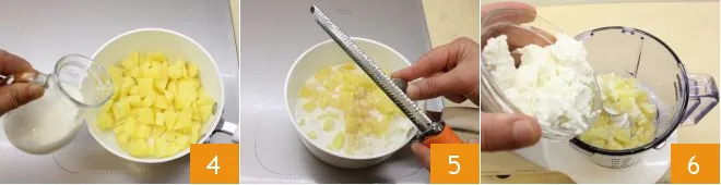 Place the diced potatoes in a small pot, pour in the milk 4, season with nutmeg 5, add salt, and cook for about 15 minutes until they are soft. Let the potatoes cool, then place them in a mixer with blades, add the ricotta 6