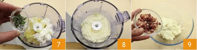the fresh marjoram leaves and a pinch of white pepper 7 and blend everything until a smooth, creamy mixture is obtained 8. Transfer the potato cream to a bowl and add the bacon cubes 9, mix with a spoon, and set aside the filling.