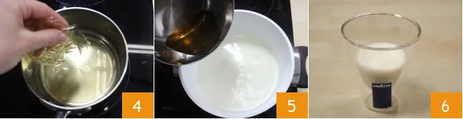 then drain the gelatin, which will have assumed a gelatinous consistency, squeeze it well with your hands and add it to the whiskey 4; stirring often to dissolve it completely. Combine everything with the cream mixture 5. Take four medium glass cups and pour 50 grams (about 1.76 oz) of the whiskey cream obtained into each; store them in the refrigerator, covered with plastic wrap, for 34 hours 6.