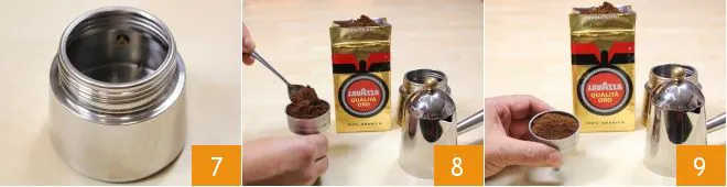 Meanwhile, prepare the coffee with the coffee maker: to obtain excellent coffee, fill the boiler of your coffee maker with cold water, preferably low in limescale, making sure not to exceed the safety valve 7 (otherwise you'll get a longer coffee). Fill the filter with ground coffee, forming a mound that you will level by tapping the filter on the table with decisive movements (8-9). Do not press with the spoon, nor make holes on the surface.