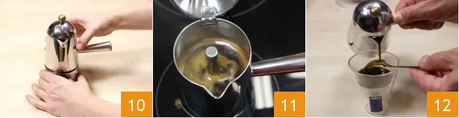 Close the coffee maker very tightly 10, so that the coffee does not leak out from the sides as it rises, and place it on a low and steady flame to obtain a full-bodied coffee. As the coffee rises, a dense foam will form 11: we recommend not letting the coffee bubble too long to keep its sweetness and aroma intact. Your coffee is ready: before using it, stir it directly in the moka with a spoon to make the coffee more homogeneous. Take the glasses with the whiskey cream from the refrigerator and pour 25 ml (just over half a cup) of hot coffee on the surface of each 12, ensuring this operation is performed slowly, with the help of the back of a spoon, to avoid mixing the coffee with the cream.