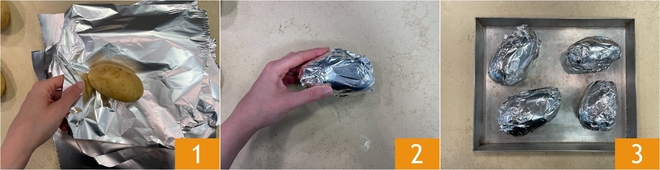 To prepare the jacket potatoes with Taleggio and leeks, start with the potatoes. Wash them well and dry them. Stack 2 sheets of aluminum foil and place one of the potatoes on top 1. Wrap it in the foil to form a packet 2. Repeat the same operation for the other potatoes and place them on a baking sheet 3. Bake in a preheated static oven at 464°F for 30 minutes; to facilitate cooking, you can place a tray with a little water at the bottom of the oven.