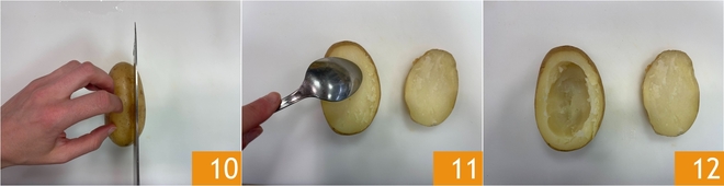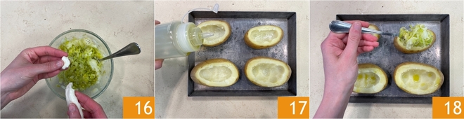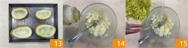 Place the hollowed potatoes on a baking sheet 13. Collect the inside of the potatoes in a bowl and season with salt, pepper, and oil 14. Add the stewed leeks 15.