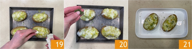 Break the remaining Taleggio on top 19 and bake in a preheated static oven at 482°F in grill mode for about 5 minutes, until the cheese is completely melted. Remove from oven, garnish with thyme 20, and serve your jacket potatoes with Taleggio and leeks hot 21!