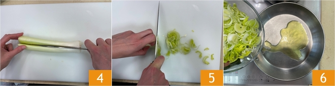 Meanwhile, take care of the leek. Remove the darker part, the one with the roots, and the outer layer by cutting it with a small knife 4, then cut it into thin slices 5. Pour a drizzle of oil into a pan and add the leek 6.