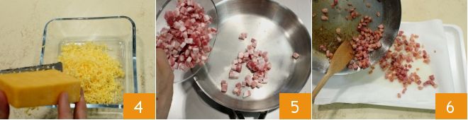 While the potatoes are cooking, grate the cheddar cheese 4, then sauté the bacon in a pan 5 to toast it. Once it's crispy, place it on a tray lined with paper towels 6.