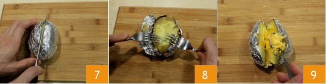 When the potatoes are cooked, take them out of the oven, and carefully not to burn yourself, place them on a cutting board: slice them lengthwise 7, open them with the help of two forks 8, then pour 1-2 teaspoons of grated cheddar into the slit of each potato 9.
