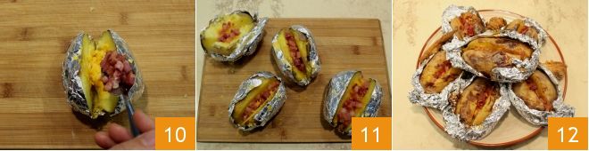 Then add a teaspoon of bacon 10. The cheese will melt with the heat and the bacon will give a savory touch to your jacket potatoes 11! Serve them piping hot 12!
