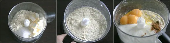Put the flour, butter cut into pieces, and sugar into the bowl of a mixer. Mix until the ingredients are reduced to small crumbs, then add the egg yolks, yogurt, lemon zest, and cinnamon. Turn on the mixer again, then take out the dough and knead it by hand for a few minutes, form a ball that you will wrap in plastic wrap and let rest in the refrigerator for half an hour.