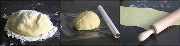 After the half-hour has passed, take the dough out of the refrigerator and roll it out with a rolling pin to form a sheet about 1/16 inch thick, then cut it into squares with 2 inch sides.