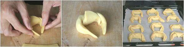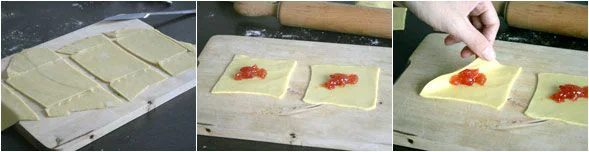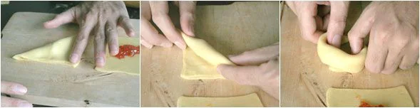 Place a tablespoon of jam in the center of each square and fold it to form a triangle. Seal the edges by pressing them lightly with your fingers, then roll the triangles onto themselves. Slightly bend the tips forward to give them a shape similar to a croissant.