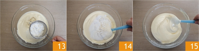 Then add some of the sifted flour 13, continue mixing with a spatula from the bottom up 14. Continue this way alternating egg whites and flour until you get a well-mixed homogeneous dough 15.