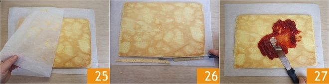Gently remove the paper used for baking 25. With a serrated knife, trim the edges. Do not let the roll cool and quickly spread the strawberry jam over the entire surface 27. If you prefer, you can use a lot of jam for more filling.