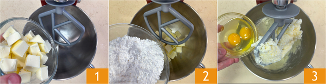 To prepare the jam tart, you can mix by hand, or use a stand mixer to make the shortcrust pastry. Place the softened butter cut into pieces in the bowl of the stand mixer 1, add the powdered sugar 2, and work at low speed with the paddle attachment until you obtain a creamy mixture. Alternatively, you can do this step with a wooden spoon or by hand. Add the eggs 3 and mix again.