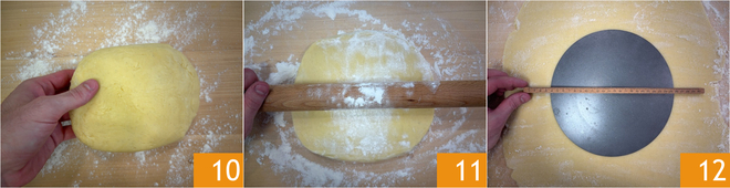 After this time, remove the plastic wrap and transfer the dough to a floured surface 10. Add a little more flour and roll it out with a rolling pin 11 to a thickness of about 0.4 inches. Place the base of the mold in the center of the pastry and measure about 2 inches more in diameter 12.