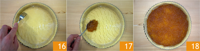 Prick the base with a fork 16 and generously fill with the jam 17, spreading it evenly 18.